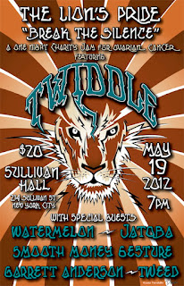 Saturday, May 19th, Twiddle is hosting the first, and hopefully annual, “The Lion’s Pride” event. “The Lion’s Pride: Break the Silence” is a one night charity jam at Sullivan Hall in NYC to raise $$ and awareness about Ovarian Cancer. A portion of all ticket sales, and money raised from raffling off signed show posters, will go to the NOCC, the National Ovarian Cancer Coalition. Twiddle will be joined by Smooth Money Gesture, Jatoba, Garrett Anderson, Tweed, and Watermelon, for an amazing night of music for a great cause.